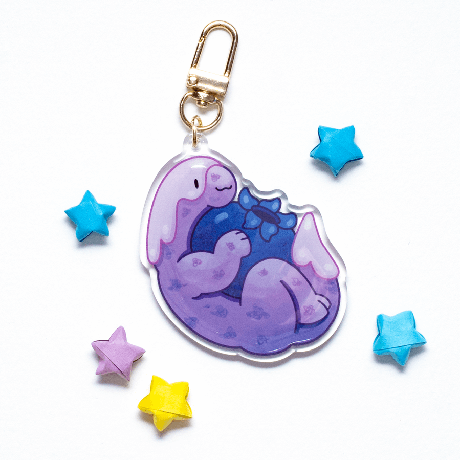 Keychains are made with acrylic, epoxy, and a metal clip. Charm is 3 inches wide.