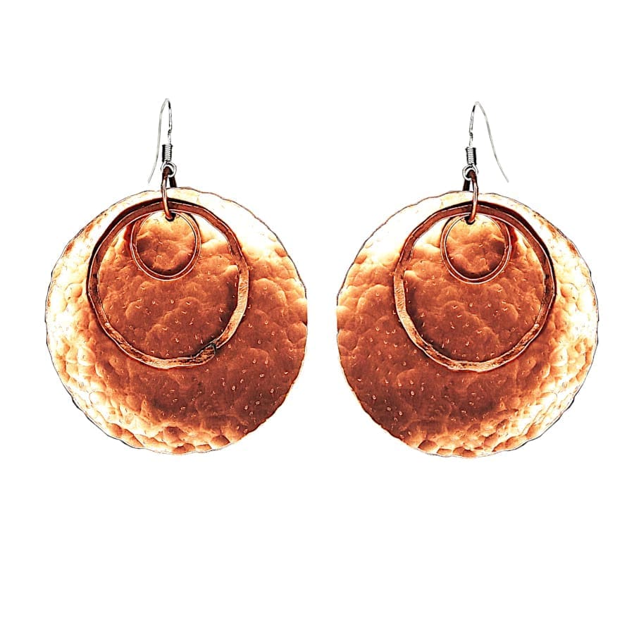 Hand-hammered salvage 24 gauge roofing copper disc, lightly dished to catch the light, with a couple of delicate hammered 16 gauge copper rings for movement. Comes with sterling hooks.