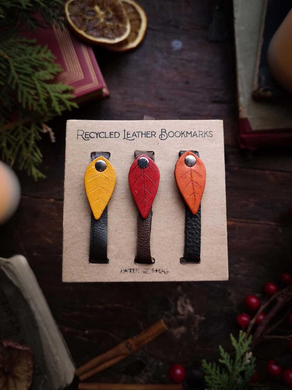 Our best selling recycled leather bookmarks as ready to gift trios! Each set of three bookmarks comes packaged on a hand-made thick craft paper card, ready for display or gifting.