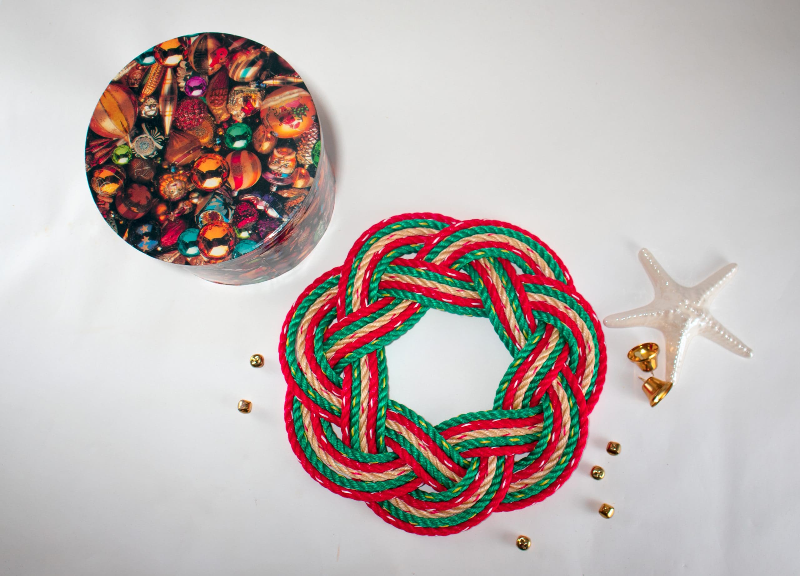 The Gingerbread Christmas Swirl Wreath incorporates the traditional North American colors of Christmas represented by the swirls of red and green with the natural manila rope color that reminds us of gingerbread and the scent of fresh Christmas baking from the oven.