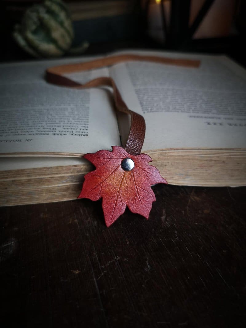 Uniquely hand carved, the leather maple leaf is securely riveted to soft and supple recycled leather that sits perfectly between the pages of your favorite book. The leaf itself is made with vegetable tanned leather, while the lace will be a lighter weight upholstery or garment leather in shades of brown. The leather used will vary, as we source it from factory remnants giving new life to these valuable textiles.