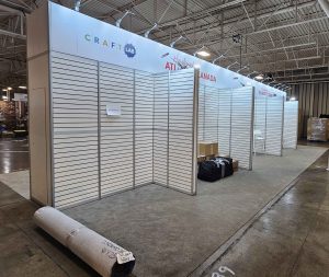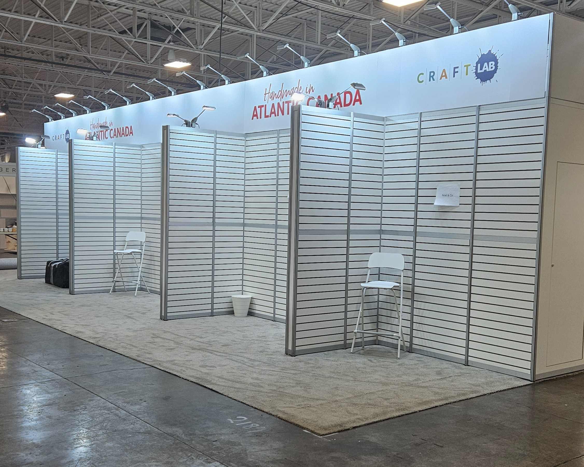 The image below is representative of our showcase booth at the CanGift at the  January 2025 trade show.  Counters are not included, but can be ordered at an additional cost. Image shown is for demonstration purposes.  The showcase space for January 2026 is the same format and size as the booth shown in the image below, it will be an 800 sq ft. space that will accommodate up to 12 producers.